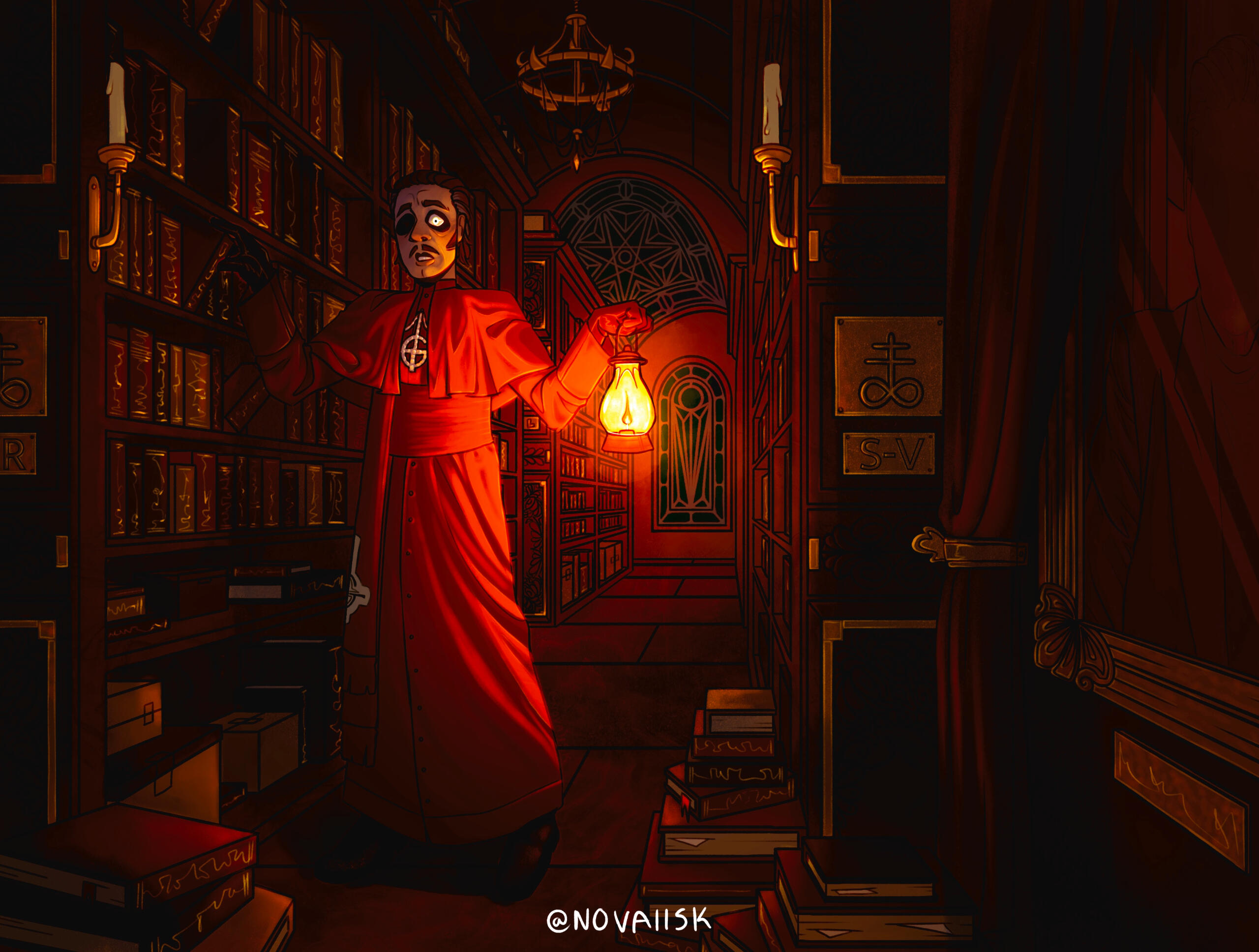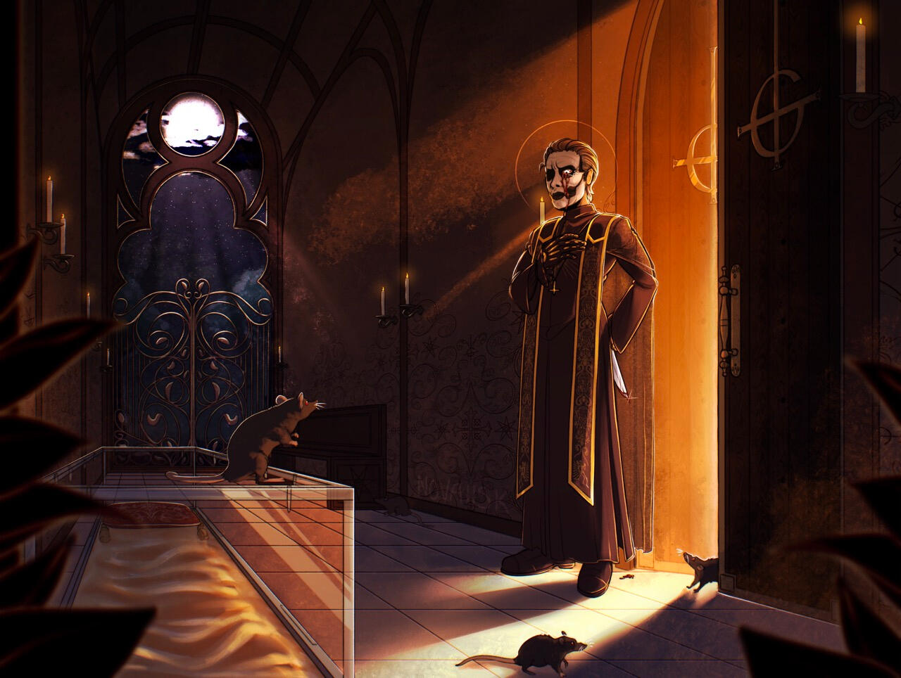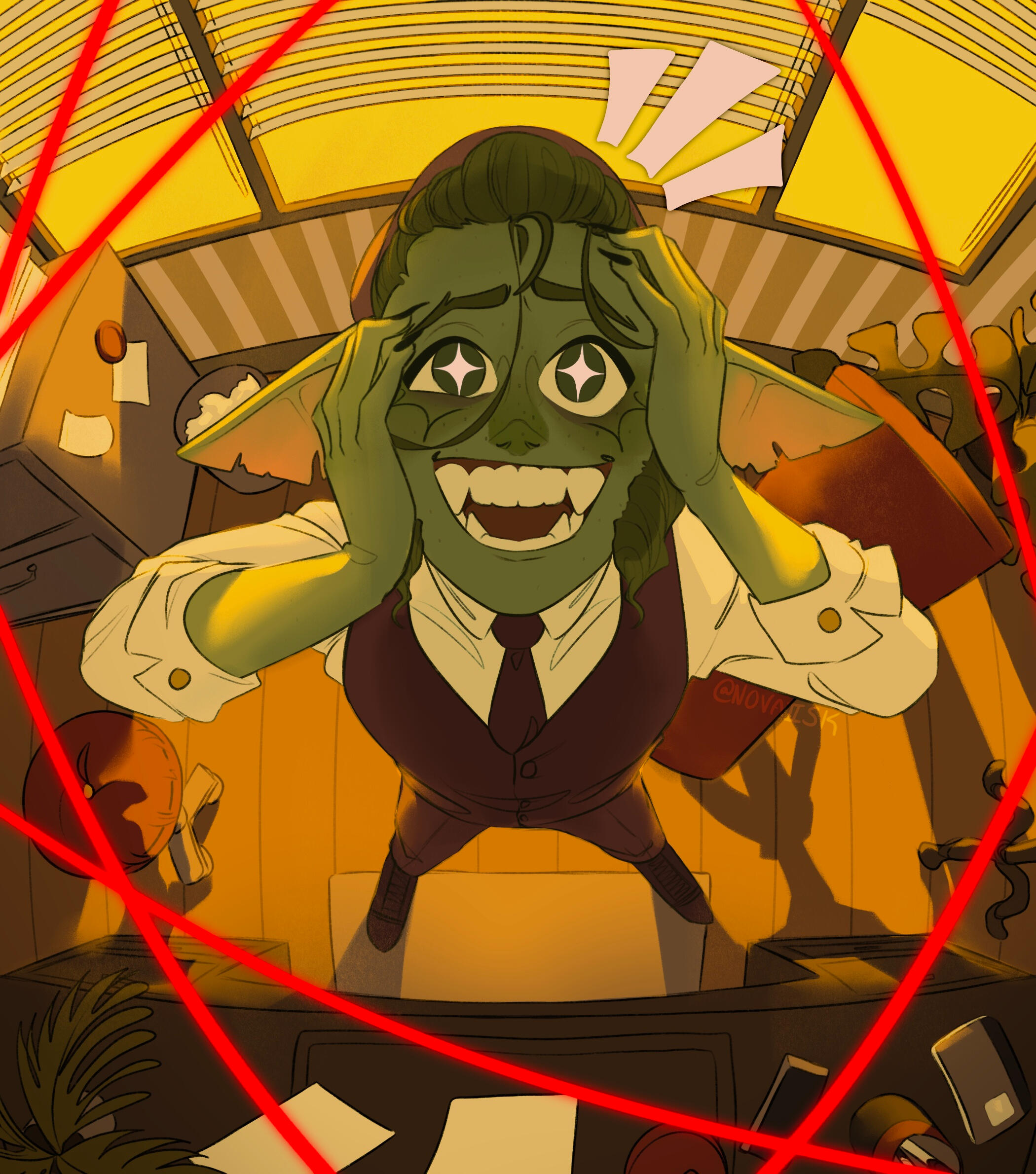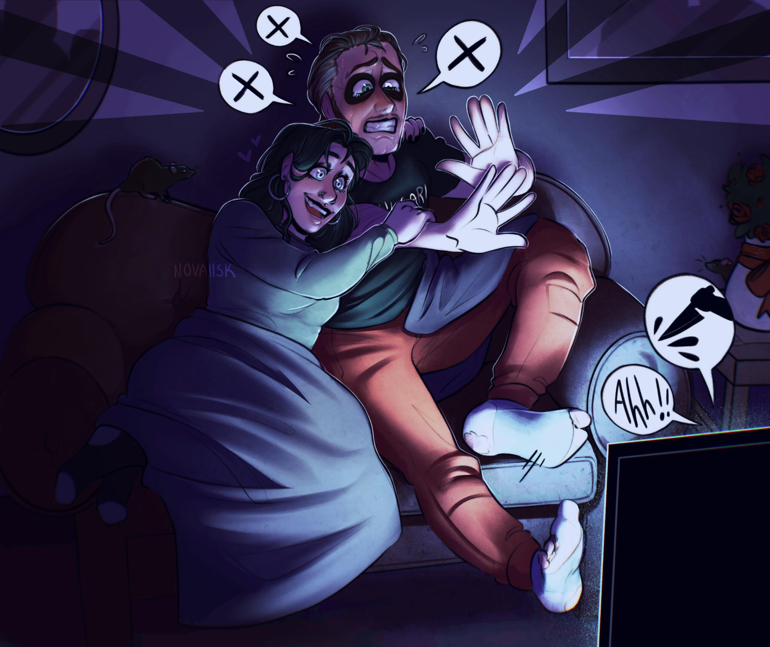 Pieces featuring more than simple props or set pieces fall under the "Scene Illustration" category.Think: Is the room or environment the character(s) are in prominently featured and/or are the character(s) interacting with it?